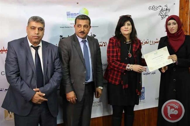 قلقيلية- معا- نظمت مؤسسة “حوار” للتنمية المجتمعية، حفل تخريج واختتام مشروع تعزيز مشاركة النساء في الانتخابات المحلية، اليوم الاثنين، في دار المحافظة في قلقيلية.