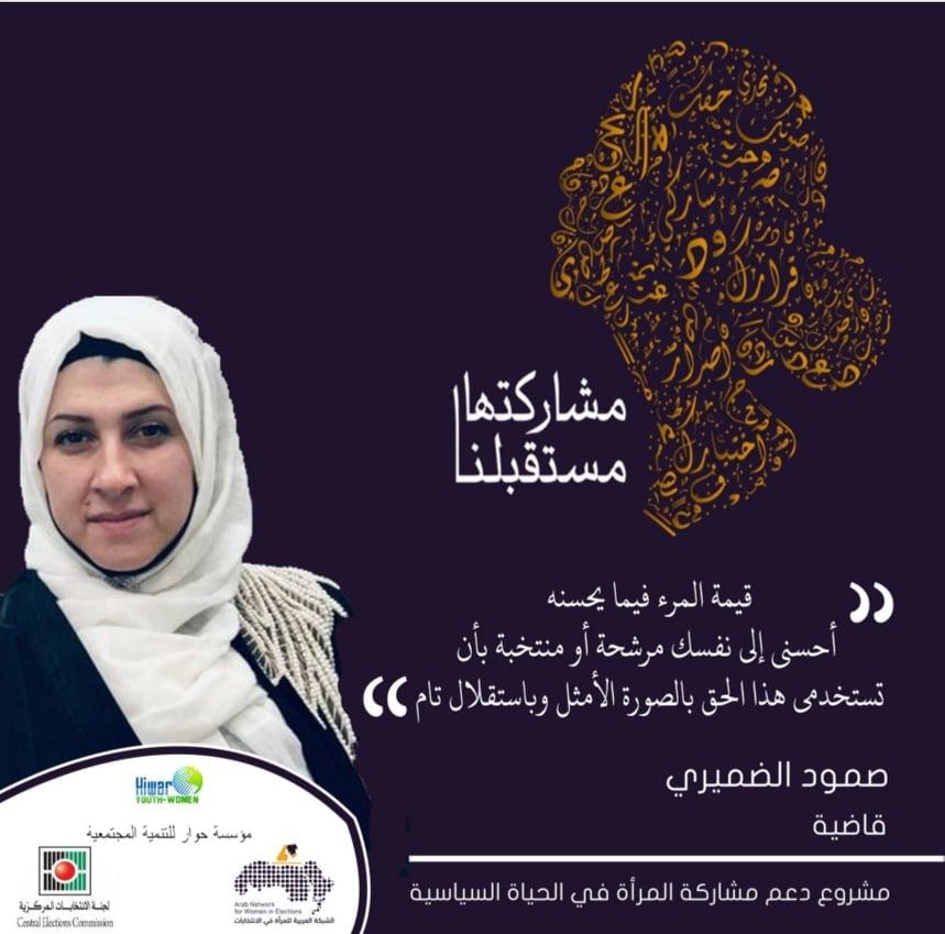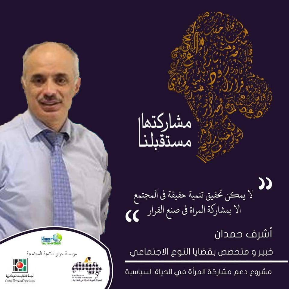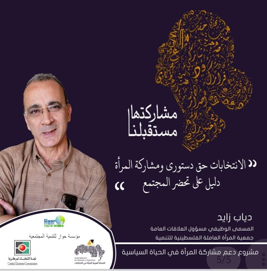 نفذت مؤسسة حوار للتنمية المجتمعية ضمن مشروع دعم مشاركة المرأة في الانتخابات ، بالشراكة مع لجنة الانتخابات المركزية الفلسطينية والشبكة العربية للمرأة في الانتخابات،لتشجيع دخل المرأة في الانتخابات والمشاركة السياسية سواء بالترشح والانتخاب من خلال صور 10 شخصيات مع مقولات خاصة بهم وبرأيهم عن تشجيه مشاركة المراة في الحياة العامة